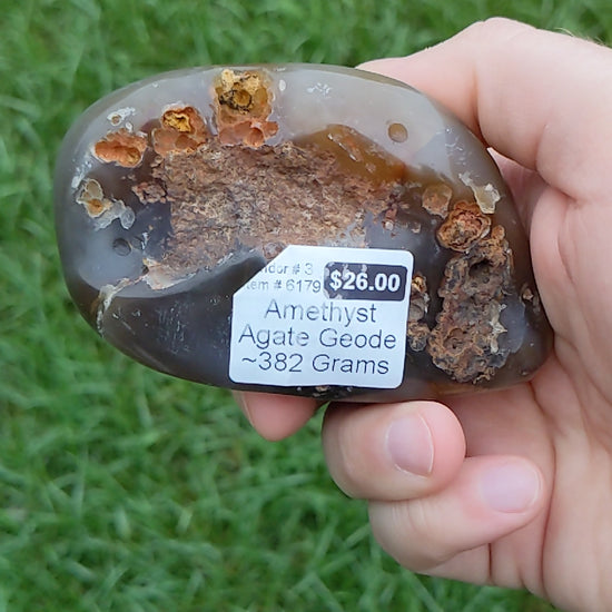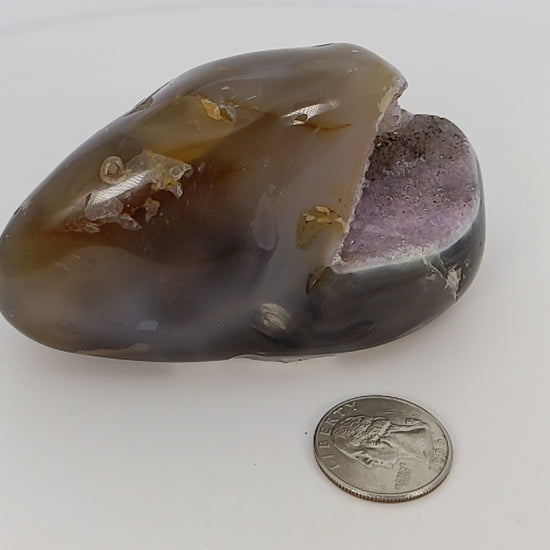 Lovely brown and gray agate with a pocket of druzy amethyst! Approximately 101 mm long on the longest side and 382 grams.