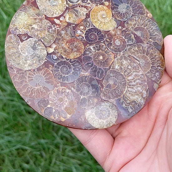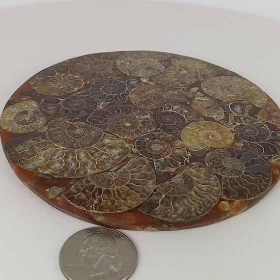 Approximately 119 mm diameter disc made from ammonite fossil pieces and resin. These look great displayed on a small easel or you could add cork or felt to the back and use it as a coaster or a base plate for other crystals! Approximately 188 grams and 7-8 mm thick.