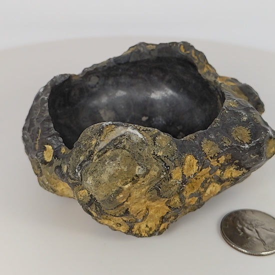 Very unique piece! Approximately 101 mm wide on the outside and 362 grams. The inside dish part is about 65 mm in diameter.