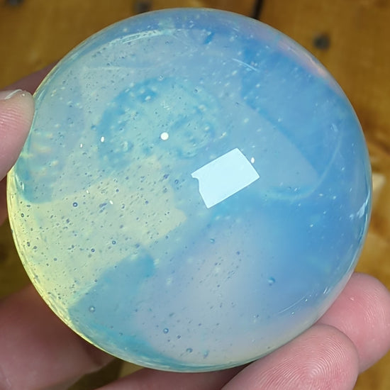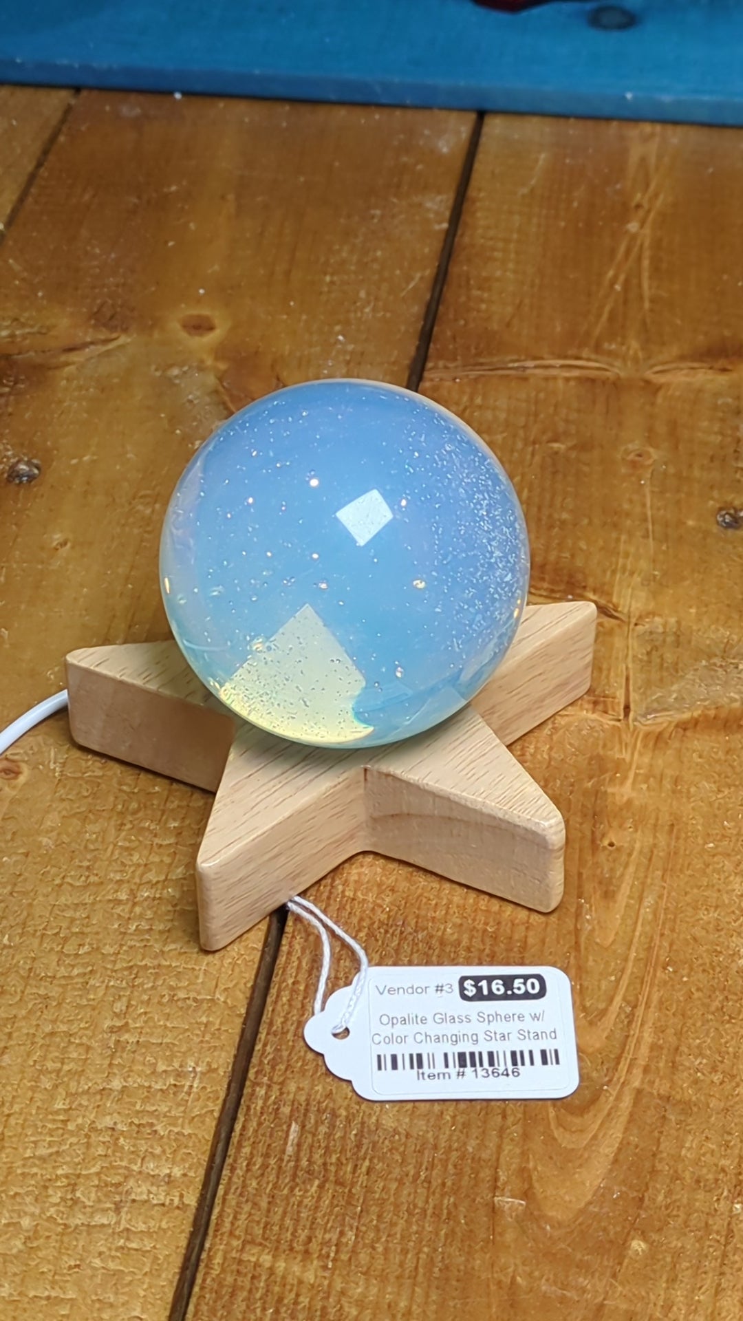Opalite bubble glass sphere (approximately 312 grams) with a lighted star stand. USB powered. The light can be cycled through single solid colors and color changing patterns by turning the switch off and on.