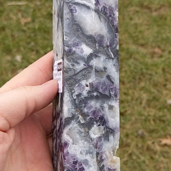 Beautiful purple, white, and gray tower with several voids! Approximately 190 mm tall and 906 grams.