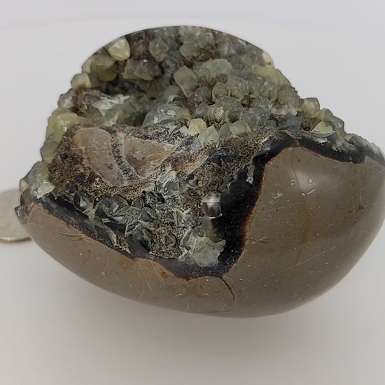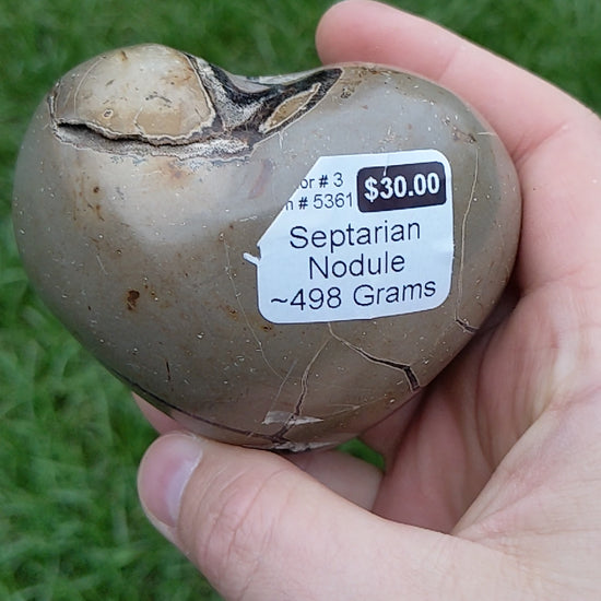 Nice chunky heart-shaped septarian nodule with calcite crystals! Approximately 90 mm wide, 76 mm tall, 58 mm thick, and 498 grams.